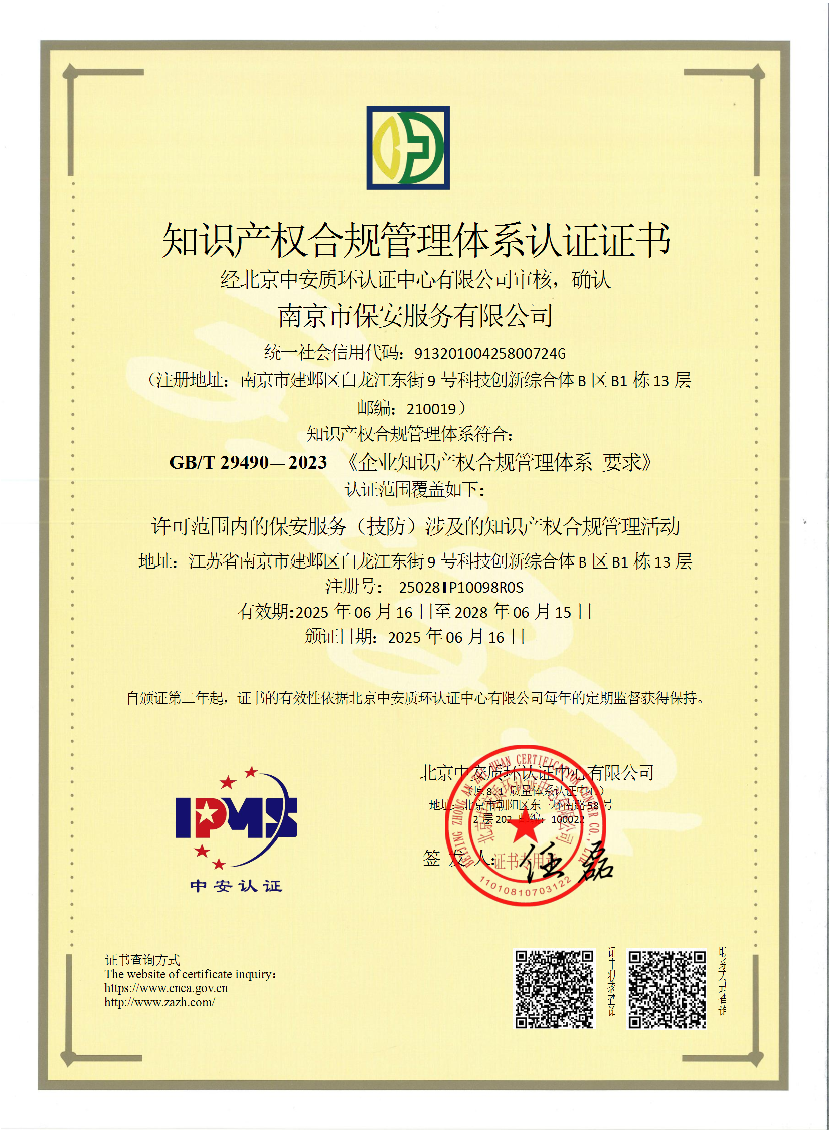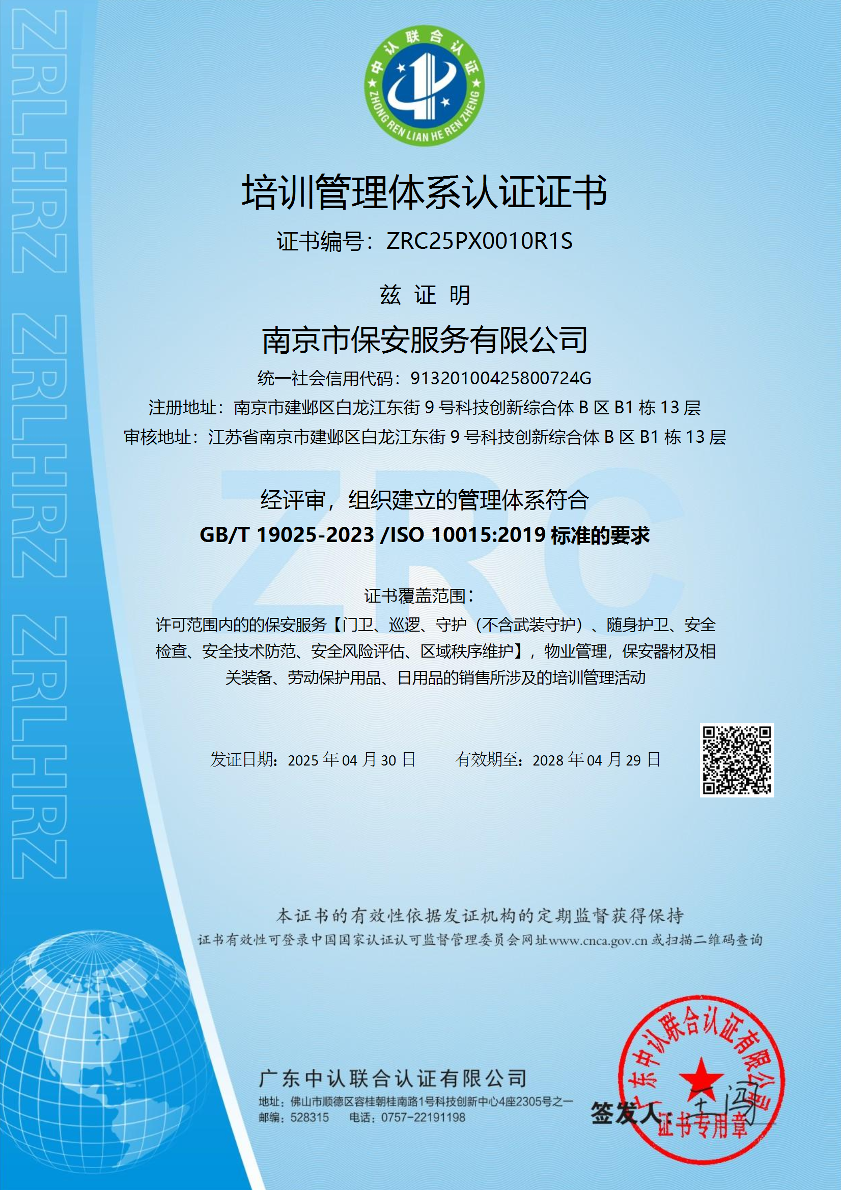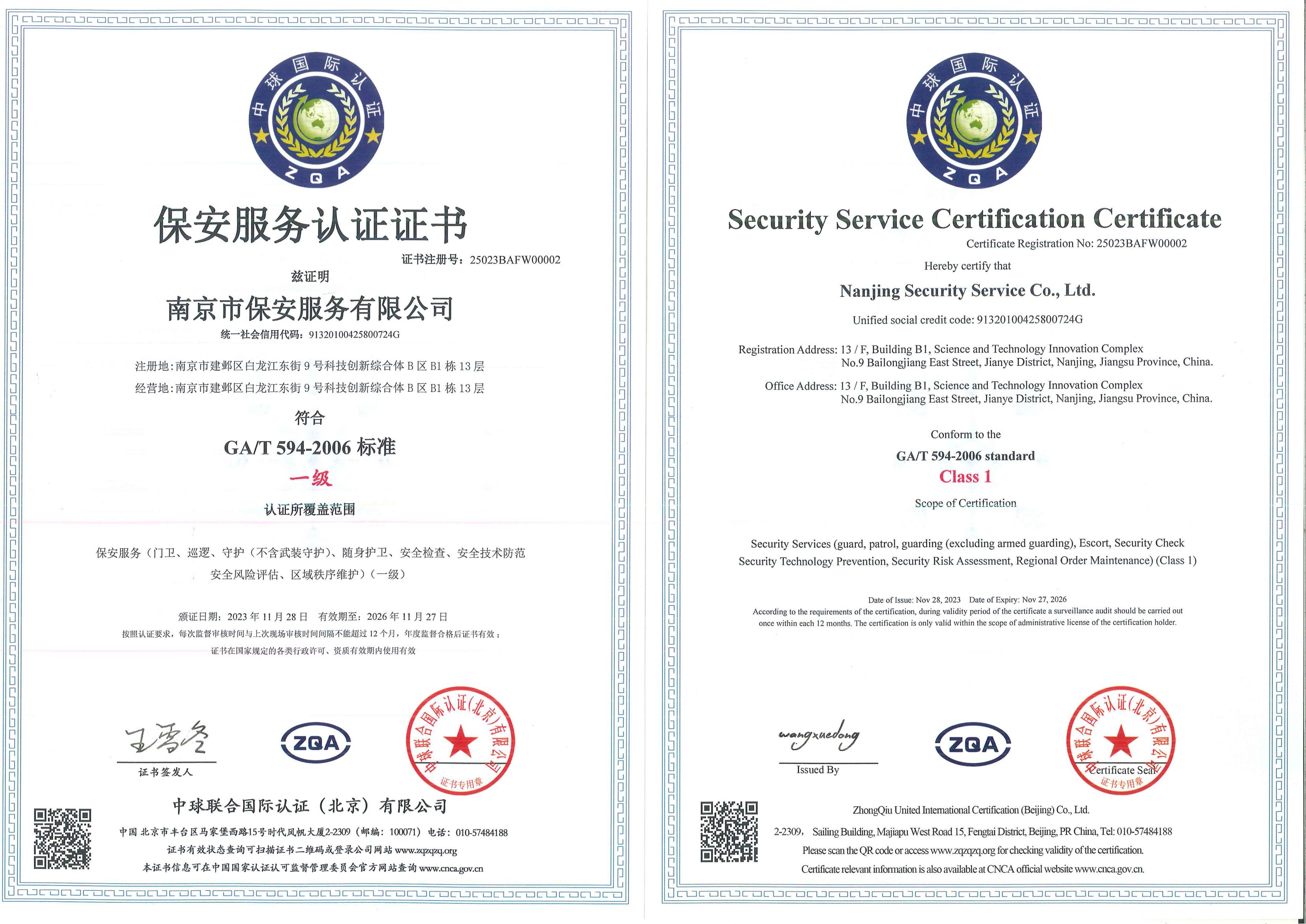 保安服務(wù)一級認(rèn)證證書